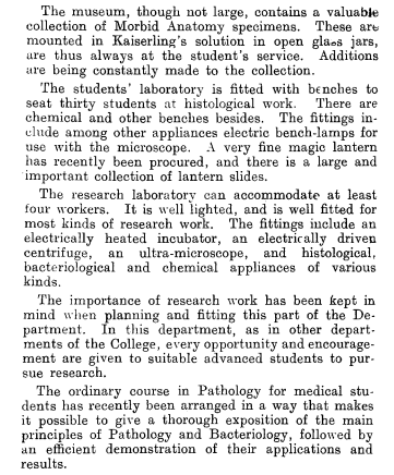 In 1914 the Pathology department was transferred to the new Civil Engineering building. This Department was situated on the top floor of the new building, and consisted of three rooms- a museum, a students' laboratory, and a research laboratory. The University Calendar recorded that the "whole has just been fitted up in the most up-to-date manner".