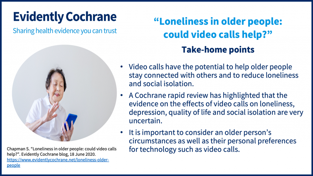 This Cochrane rapid review searched for randomised trials that looked at the effects on mental health and loneliness of video calls for people aged 65 years or living in nursing homes.