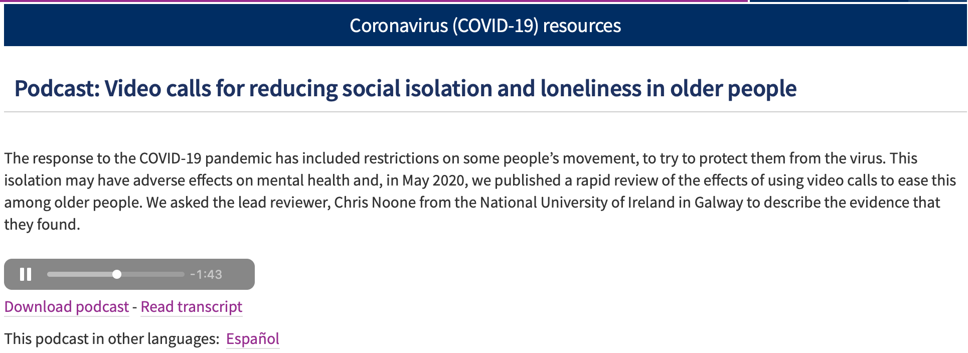Based on the evidence available at the time of this review, the effects of video calls on the mental health or loneliness of older people are uncertain. More studies testing the effectiveness of video calls for loneliness or isolation are needed. Lead author Dr Chris Noone describes what they found in the podcast.