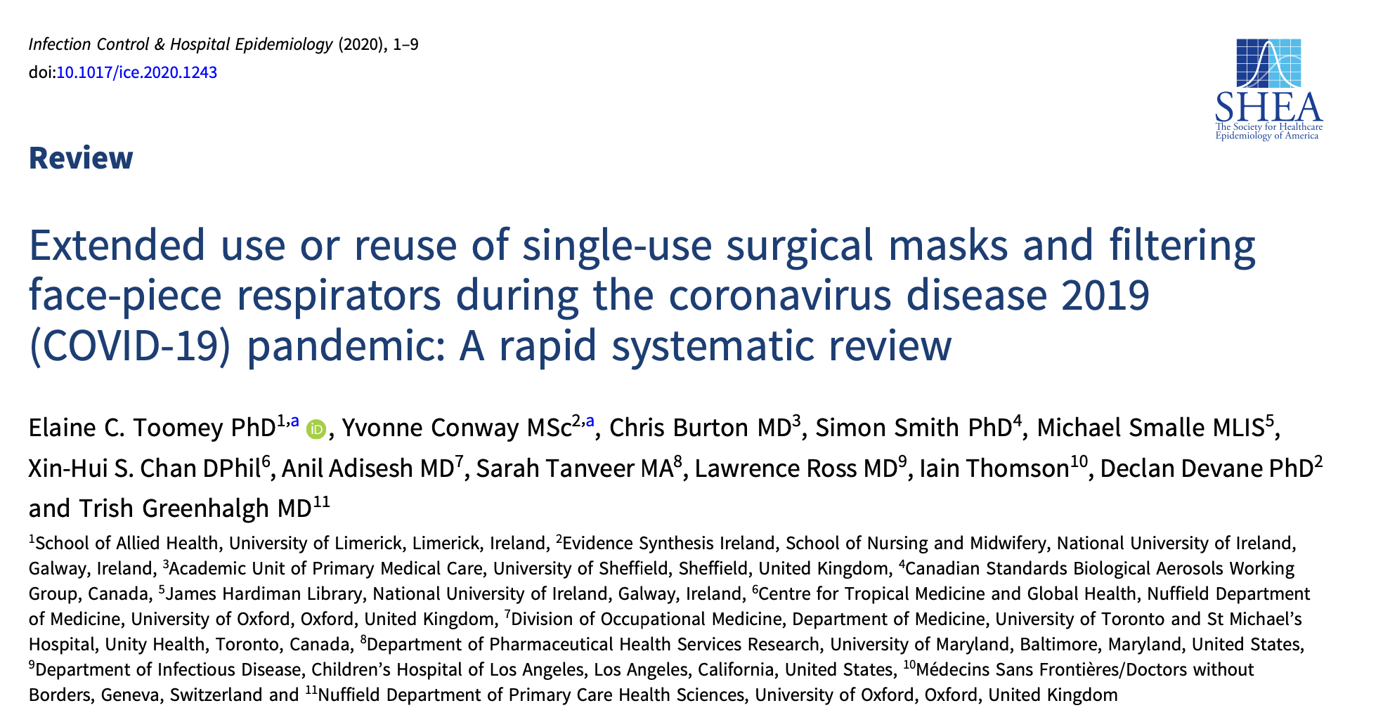 Global shortages of PPE forced the consideration of extended use and reuse of face masks. This rapid review was carried out to inform evolving policies and practice and was published in September 2020 in Infection Control & Hospital Epidemiology.